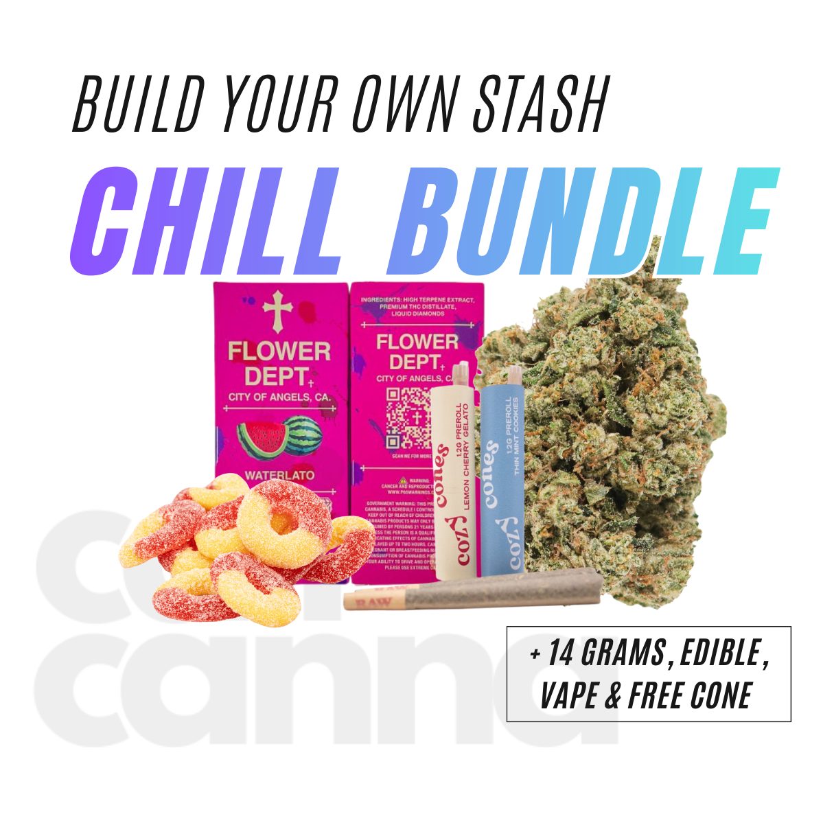 Create your perfect chill stash and save. Choose 1 flower strain, 1 vape, 1 edible get 20% OFF