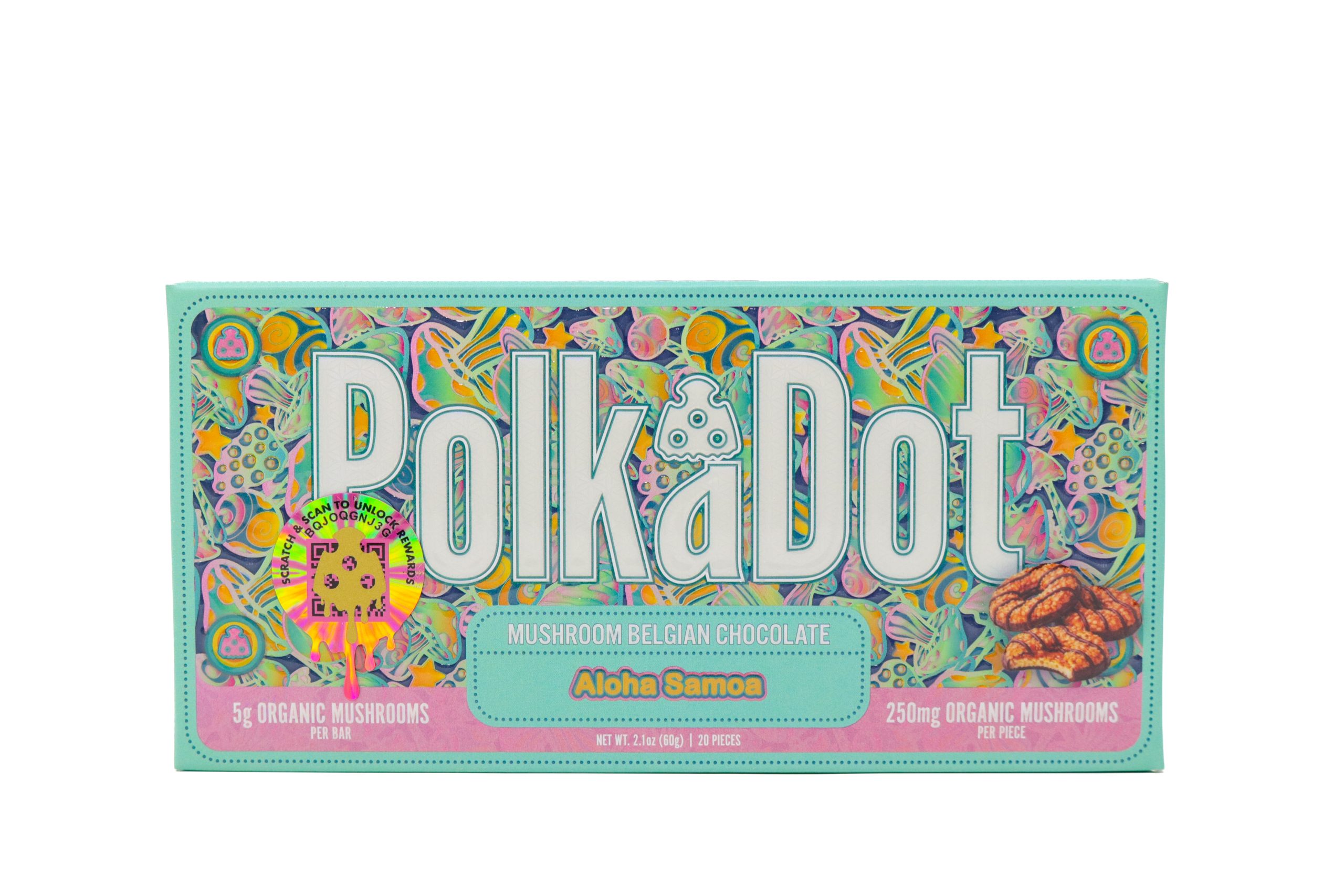 Treat your taste buds and escape to a tropical-inspired indulgence with Polka Dots Magic Chocolate (5g) – Aloha Samoa. This mushroom-infused chocolate bar blends smooth, creamy chocolate with coconut-forward flavors and subtle caramelized sweetness, creating a rich island-style experience in every bite.
