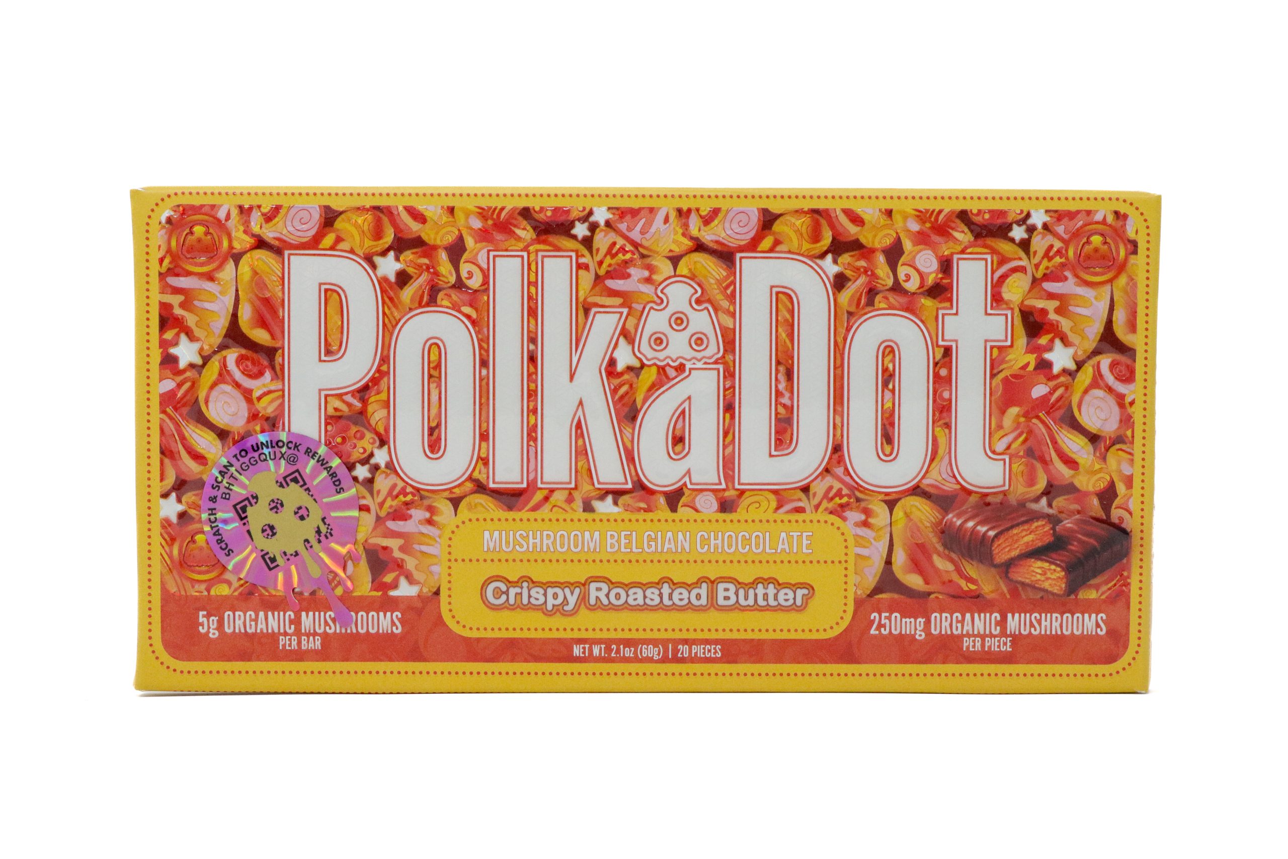 Treat your taste buds and elevate your daily ritual with Polka Dots Magic Chocolate (5g) – Crispy Roasted Butter. This mushroom-infused chocolate bar blends smooth milk chocolate with rich roasted butter notes and delicate crispy crunch for a perfectly balanced sweet and savory indulgence.