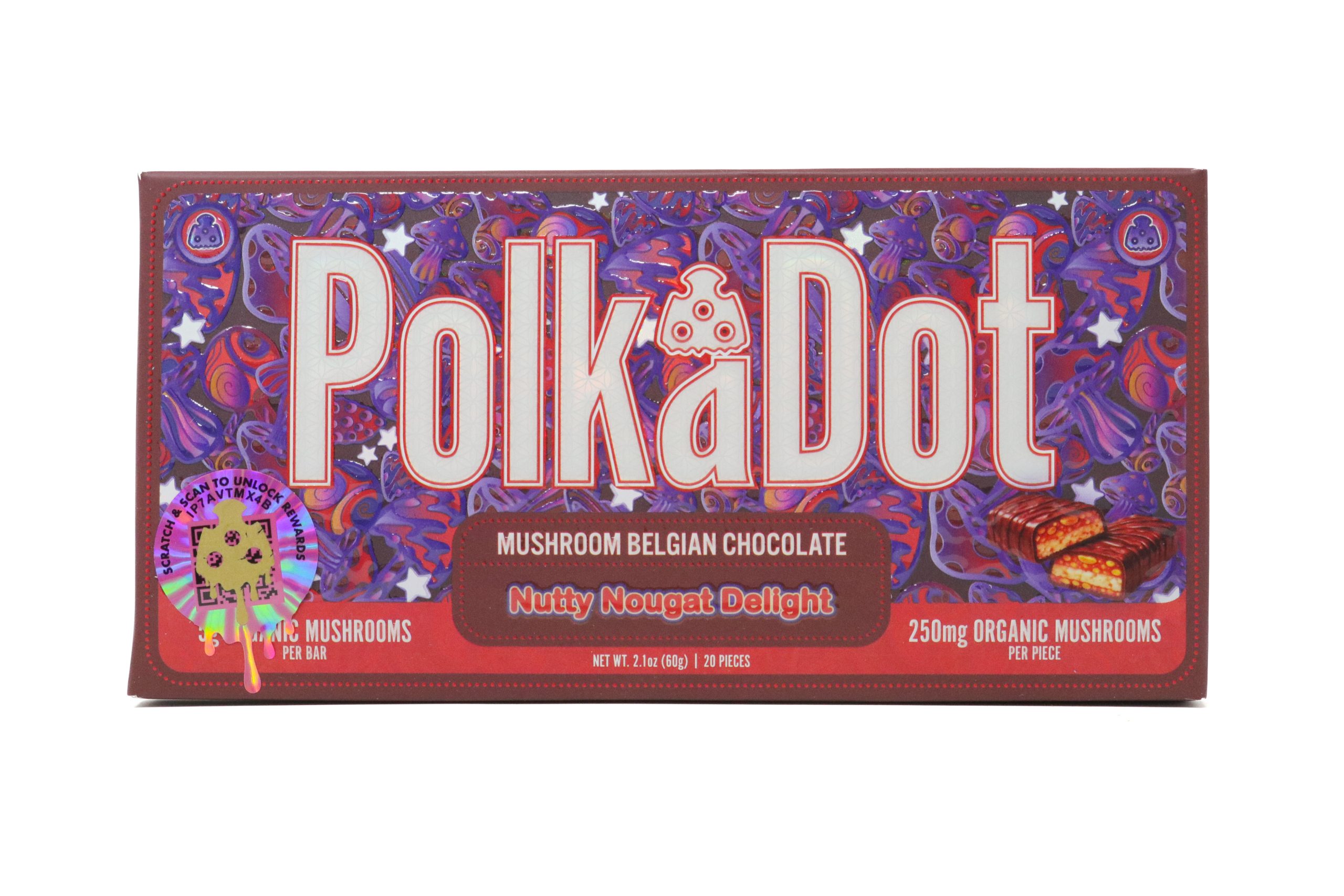 Treat your taste buds and elevate your daily ritual with Polka Dots Magic Chocolate (5g) – Nutty Nougat Delight. This mushroom-infused chocolate bar blends smooth milk chocolate with layers of creamy nougat and roasted nut pieces, creating a perfectly balanced combination of sweetness and crunch in every bite.
