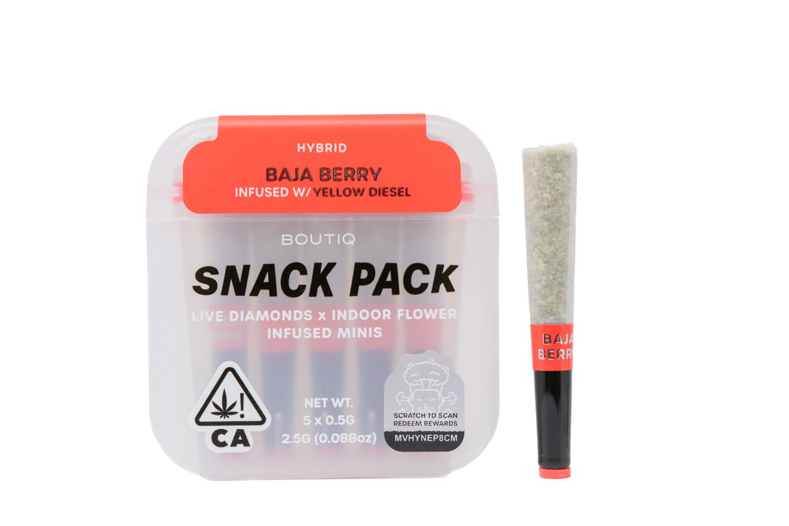 Boutiq Snack Pack (2.5g) – Baja Berry is a hybrid strain presented in a convenient multi-pre-roll format. Baja Berry features a fruit-forward flavor profile with sweet berry notes and subtle citrus undertones, offering a smooth and approachable taste.