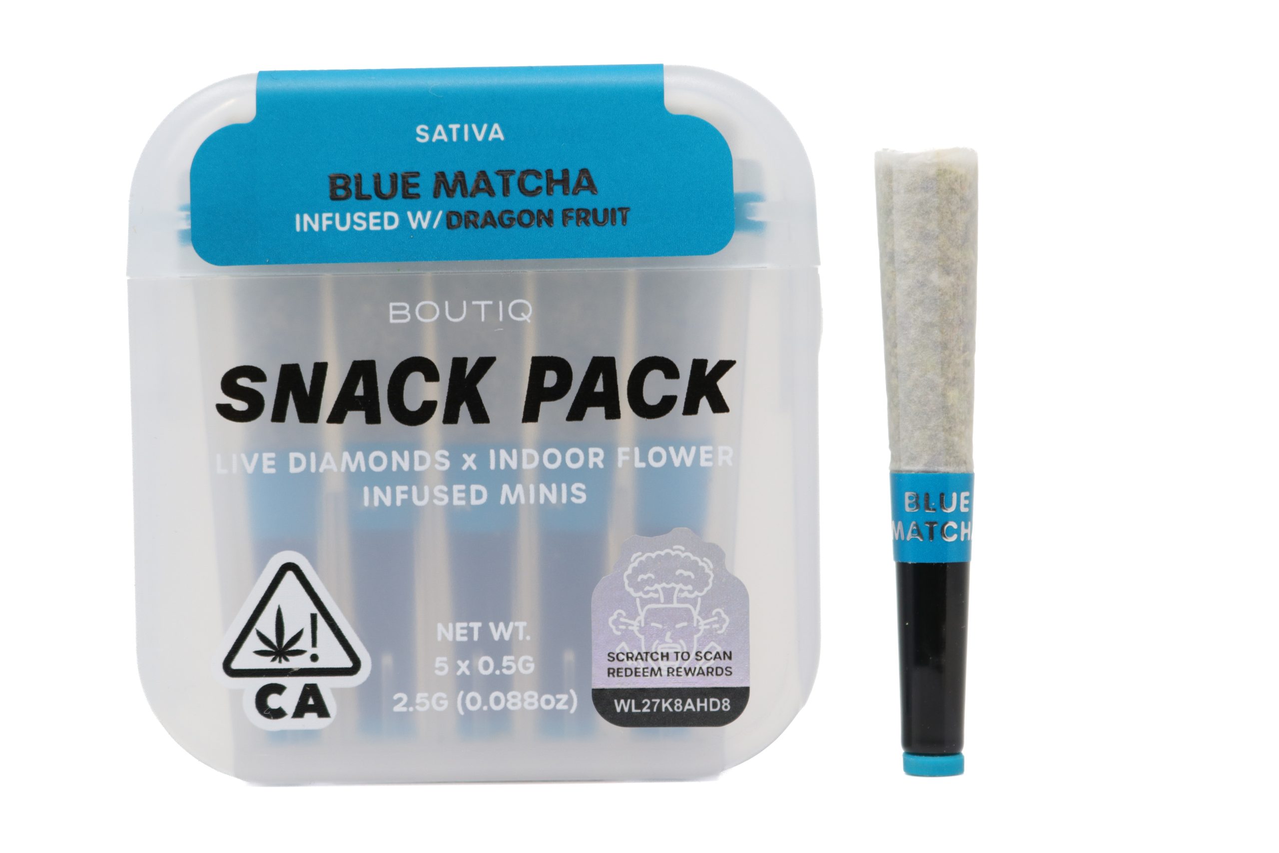 Each Snack Pack includes five perfectly rolled 0.5g pre-rolls (2.5g total), made only from premium whole flower — never trim or shake — ensuring consistent quality, slow burns, and clean exhales. Blue Matcha delivers balanced hybrid effects that promote mental clarity, creativity, and calm relaxation, making it a perfect choice for daytime flow or evening chill.