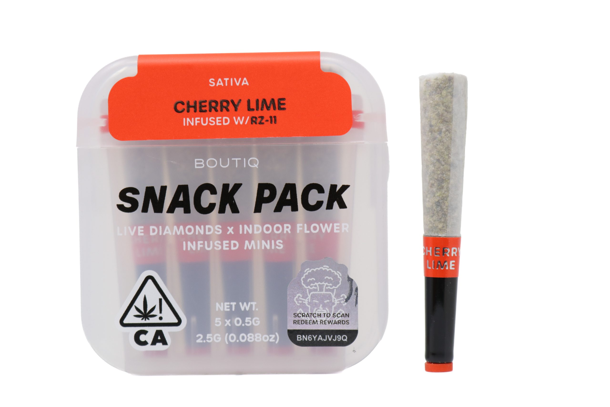 Elevate your session with the Boutiq Snack Pack (2.5g) – Cherry Lime Infused With RZ-11, a premium pack of infused mini pre-rolls crafted for bold flavor, smooth potency, and consistent performance. This sativa-leaning blend combines the tart, candy-sweet burst of Cherry Lime with the uplifting, gas-tinged brightness of RZ-11, delivering a vibrant terpene profile of zesty citrus, ripe cherry, and subtle creamy undertones.