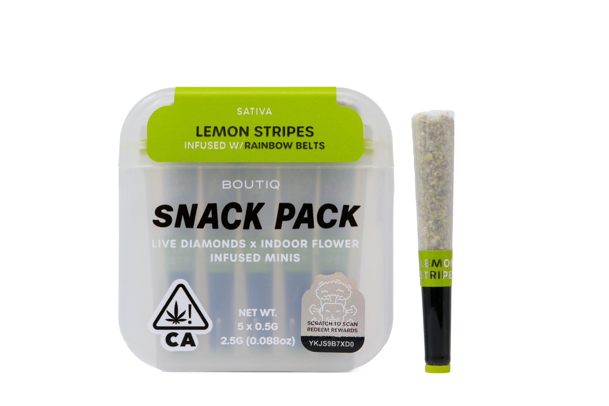 Each Snack Pack includes five 0.5g pre-rolls (2.5g total), made exclusively with premium whole flower — never trim or shake — to ensure consistent quality and an even burn. As a sativa-classified strain, Lemon Stripes reflects genetic characteristics commonly associated with energetic and uplifting profiles.