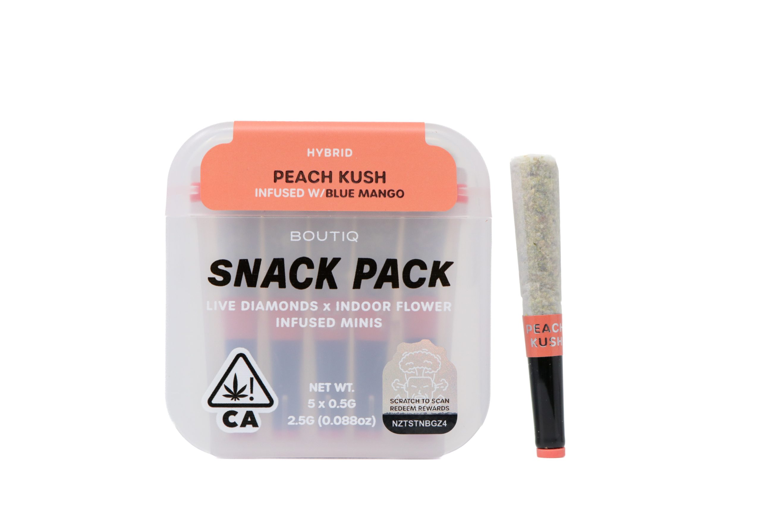 Boutiq Snack Pack (2.5g) – Peach Kush is a hybrid strain offered in a convenient multi-pre-roll format. Peach Kush features a sweet, fruit-forward flavor profile with juicy peach notes and subtle earthy undertones, delivering a smooth and balanced experience.