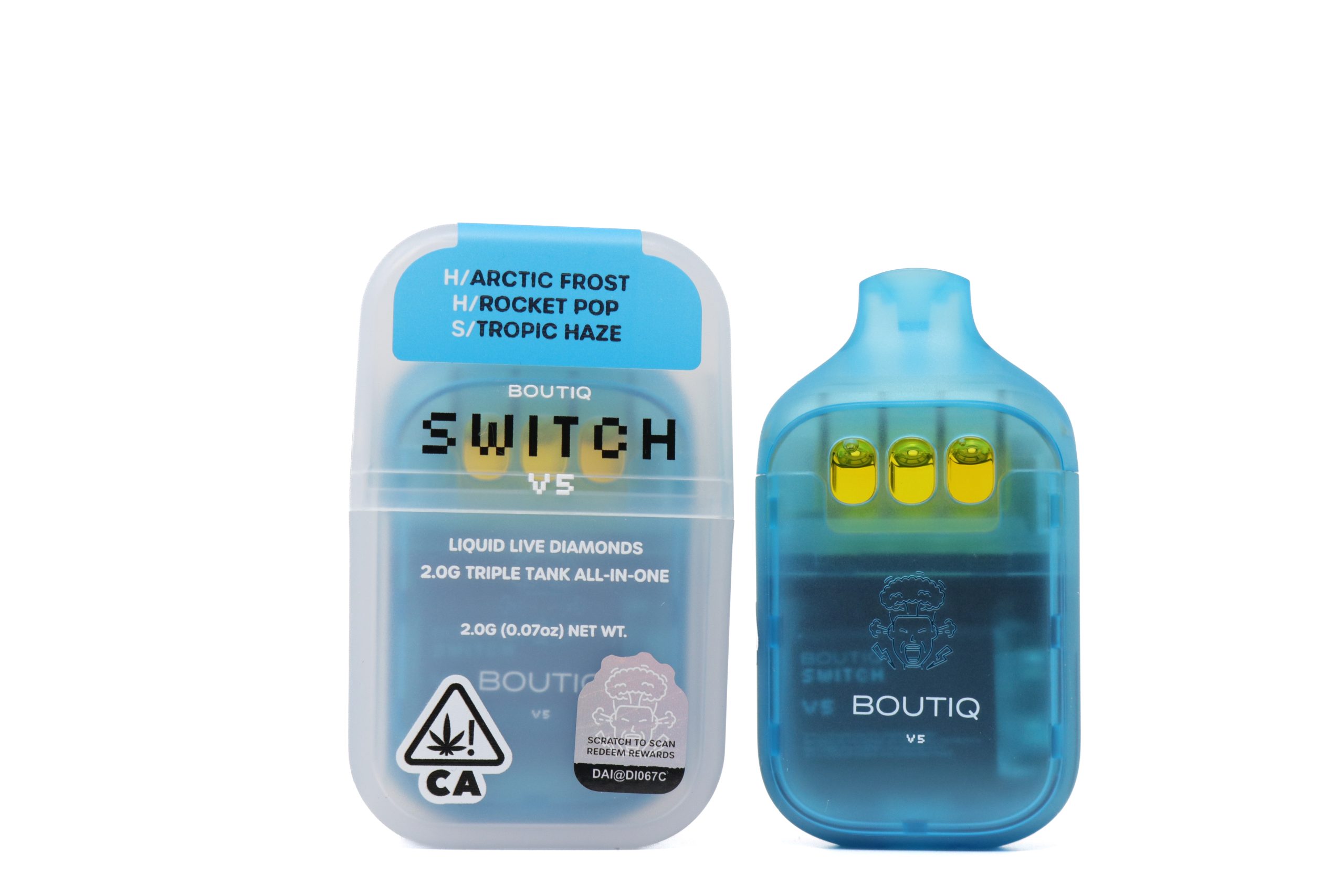 Take your vaping experience to the next level with the Boutiq Switch V5 (2g) – Arctic Frost x Rocket Pop x Tropic Haze, a triple-chamber disposable designed for ultimate versatility. Switch between strains or blend them for a personalized session with a unique combination of flavors and effects.