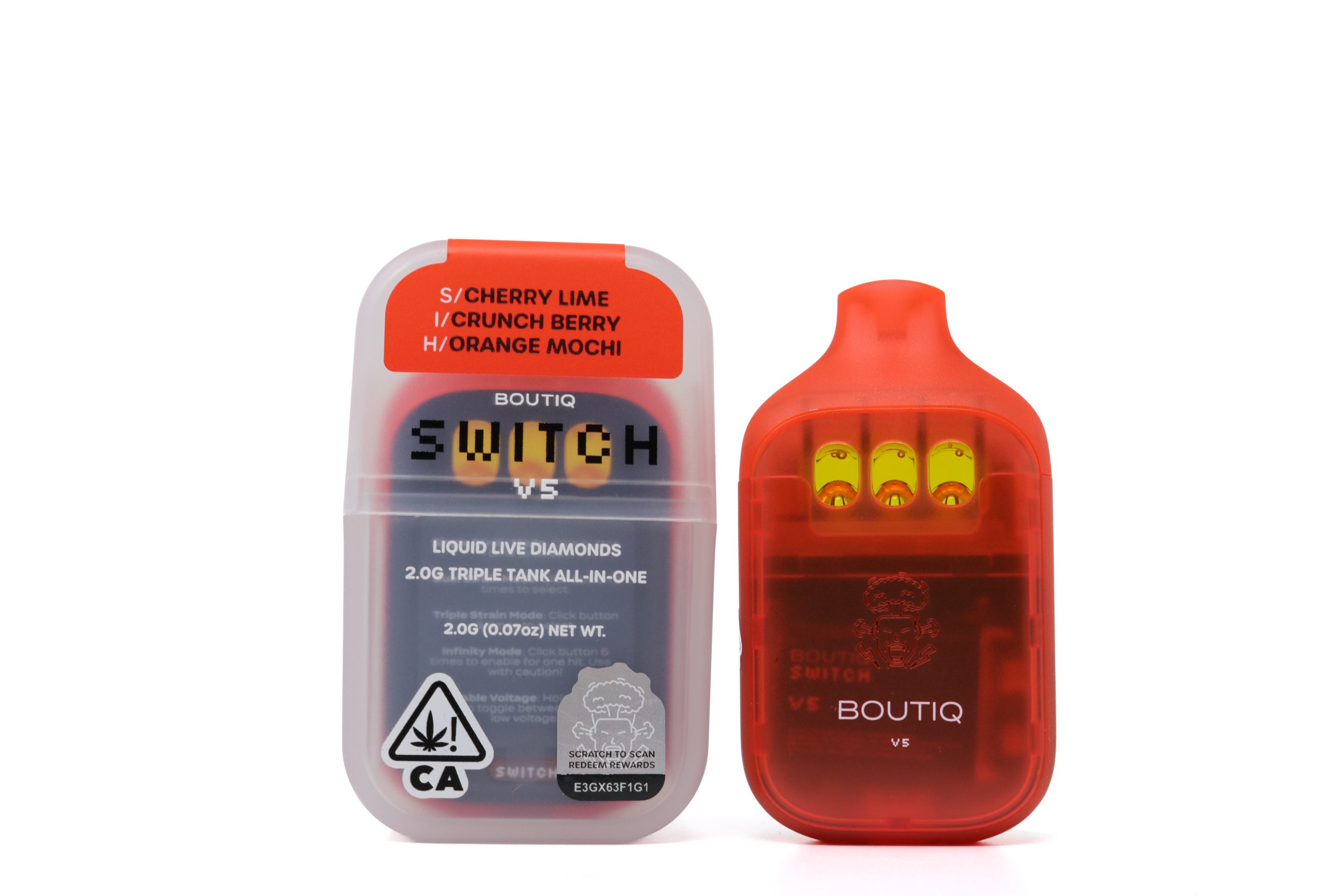 Enjoy complete control over your flavor and effects with the Boutiq Switch V5 (2g) – Cherry Lime x Crunch Berry x Orange Mochi, a triple-chamber disposable crafted for those who love bold, fruity blends and customizable sessions. Switch effortlessly between strains or blend all three to create your perfect mix of taste and experience.