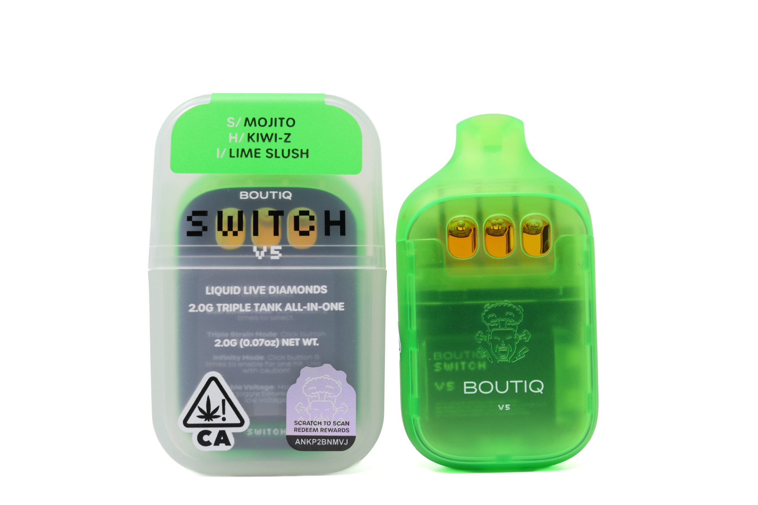 Turn every puff into a tropical escape with the Boutiq Switch V5 (2g) — a triple-chamber disposable vape featuring Mojito, Kiwi-Z, and Lime Slush. Effortlessly switch between each strain or blend them together to create your own refreshing, flavor-packed session.