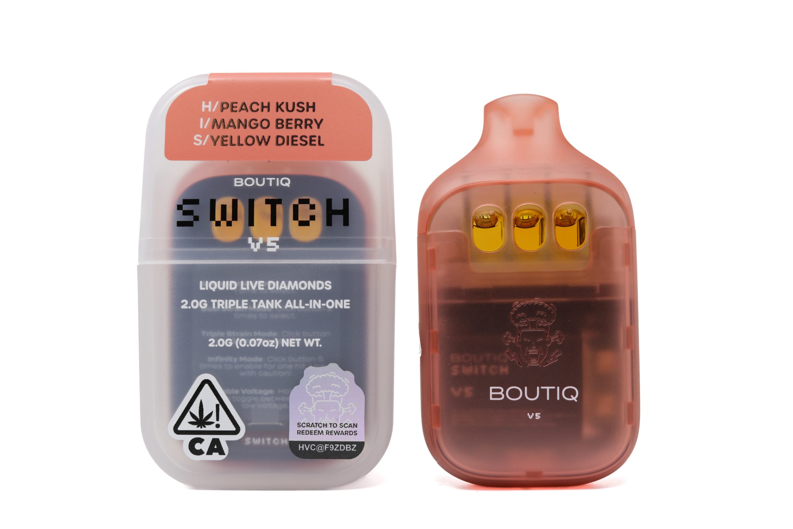 Find your perfect balance of flavor and effect with the Boutiq Switch V5 (2g) — a triple-chamber disposable vape featuring Peach Kush, Mango Berry, and Yellow Diesel. Effortlessly toggle between strains or blend them for a flavorful, energizing, and relaxing experience tailored to your mood.
