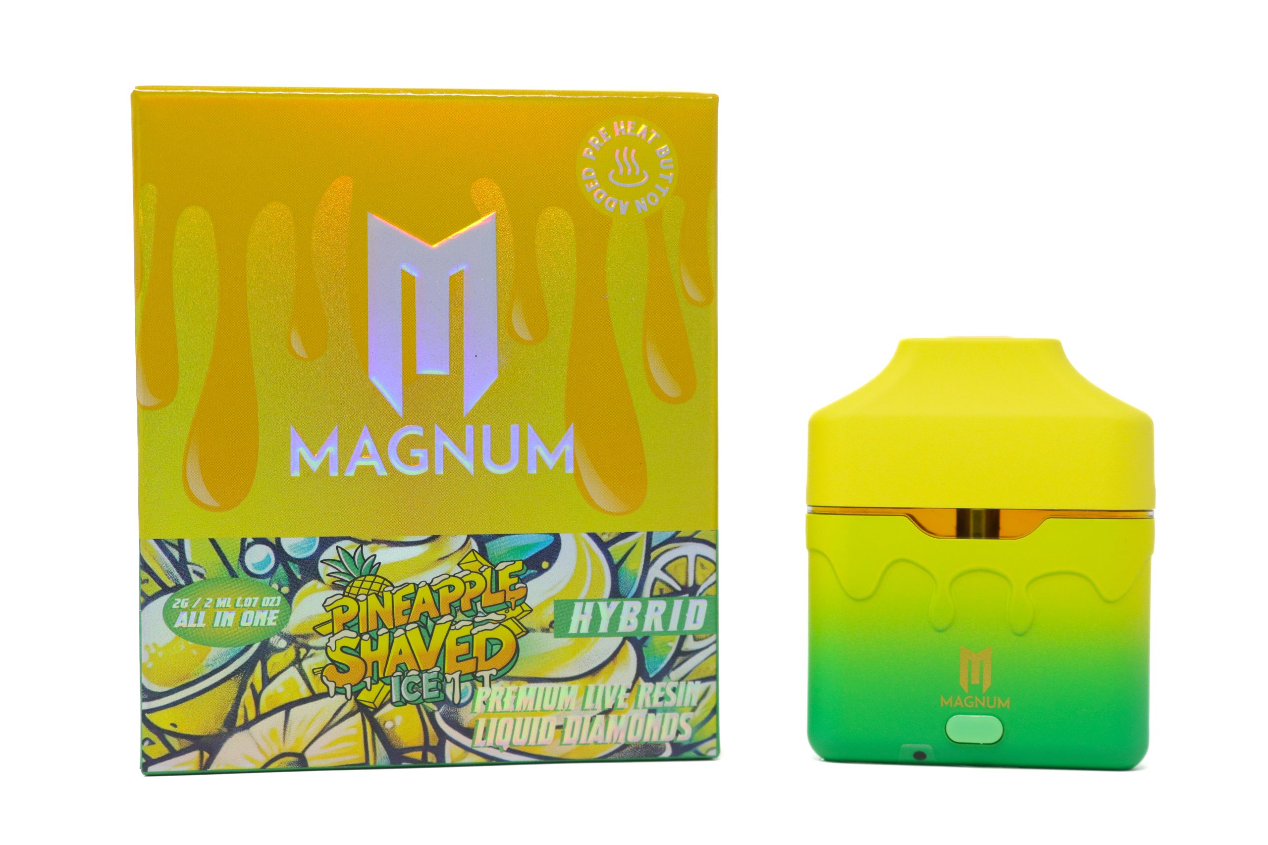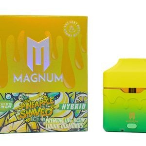Cool off with bold tropical flavor and balanced effects in the Magnum Dispo (2g) – Pineapple Shaved Ice (Hybrid). This premium disposable vape delivers 2 grams of high‑quality extract in a sleek, all‑in‑one device — pre‑filled and draw‑activated for effortless, button‑free use.